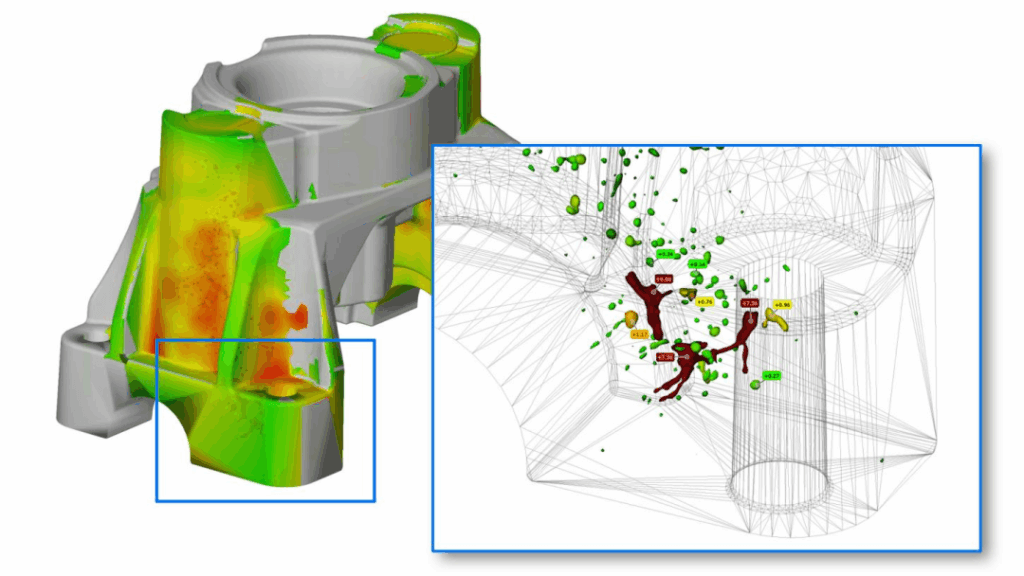 Phần mềm ZEISS INSPECT có khả năng tự động phát hiện các khuyết tật trên bề mặt và bên trong vật đúc (như vết nứt, lỗ khí...), giúp người dùng kịp thời nhận diện và xử lý vấn đề, từ đó nâng cao chất lượng sản phẩm.
