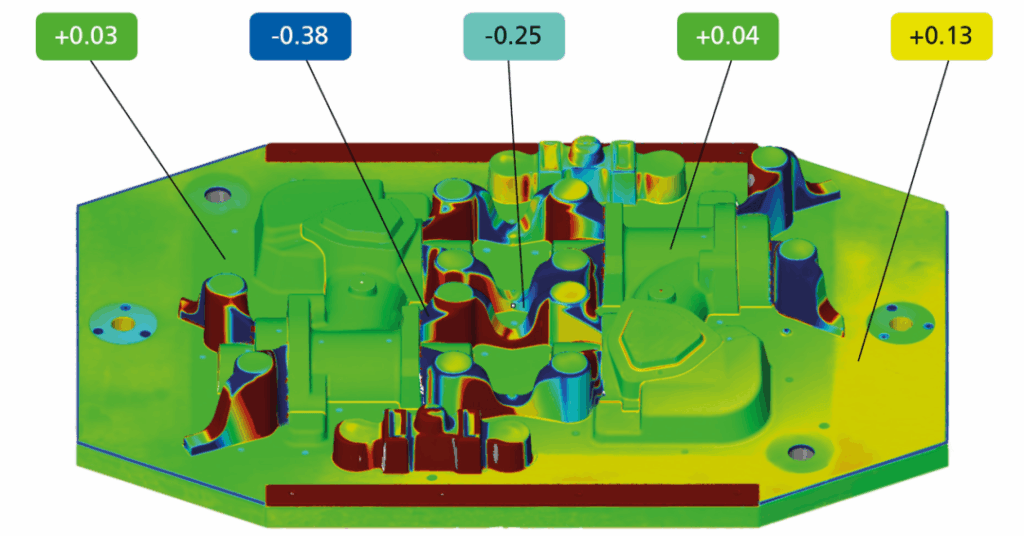 Kết quả đo độ chính xác cao và có khả năng truy xuất nguồn gốc đảm bảo nhận diện nhanh chóng cả những sai lệch nhỏ nhất, từ đó kịp thời thực hiện biện pháp ứng phó. Dụng cụ và mô hình được hiệu chỉnh có mục tiêu thông qua so sánh bề mặt màu sắc với dữ liệu CAD. Ngoài ra, còn kiểm tra sự phối hợp của nửa khuôn, lõi và thanh trượt. Trong quá trình thử khuôn, nhân viên đo lường kiểm tra hình dạng và độ chính xác kích thước vật đúc. Khi so sánh các bộ phận, độ lặp lại kiểm tra cao là vô cùng quan trọng.